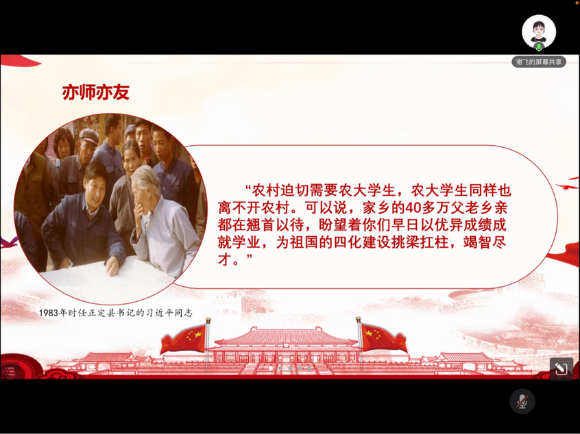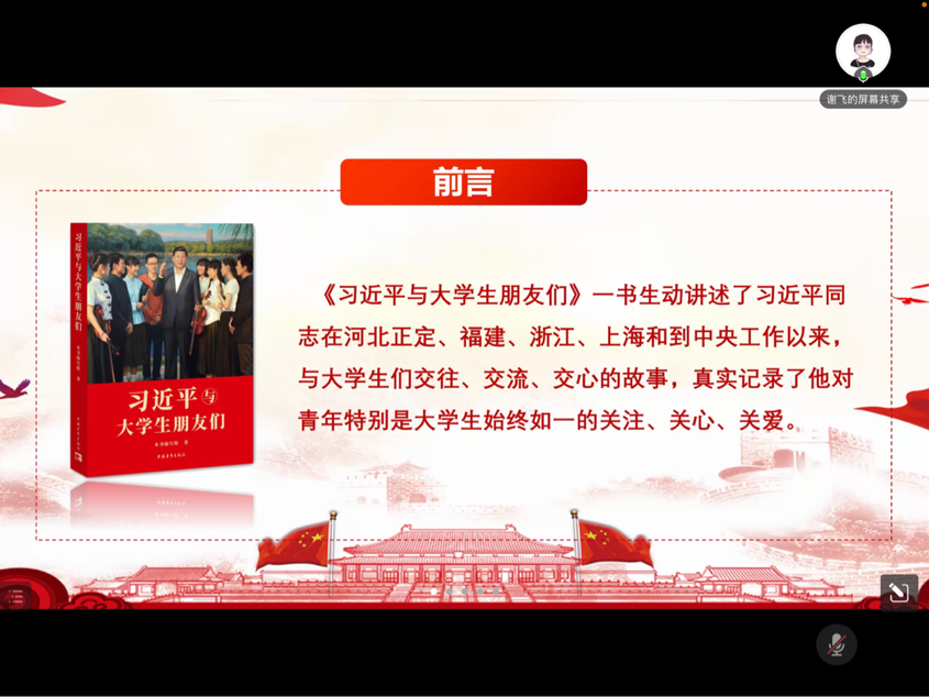 首先,谢老师与同学们分享了自己学习《习近平与大学生们》一书后的体会。该书通过25篇访谈实录讲述了1983年12月至2019年7月间,习近平同志在正定、福建、浙江、上海和到中央工作以来,与大学生们交往交流交心的故事,真实记录了他对青年特别是大学生始终如一的关注、关心、关爱。总书记无论多忙碌都会抽出时间给大学生写信,到学校看望大学生,与大学生座谈讲话,他总是那样平易近人,热情坦诚。