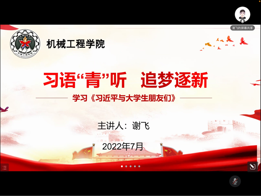 为了深入学习宣传贯彻《习近平与大学生朋友们》,引导广大青年学生树立矢志不渝的理想追求、爱国为民的家国情怀、勤奋好学的进取精神、求真务实的良好作风、吃苦耐劳的优秀品质,学习感悟习近平总书记关于青年工作的重要思想,开云kaiyun官方网站于2022年7月28日上午11:00线上开展学习《习近平与大学生朋友们》宣讲会。本次主讲人为开云kaiyun官方网站团委书记谢飞老师,汽车BG211团支部、分团委全体团干部参会学习 。