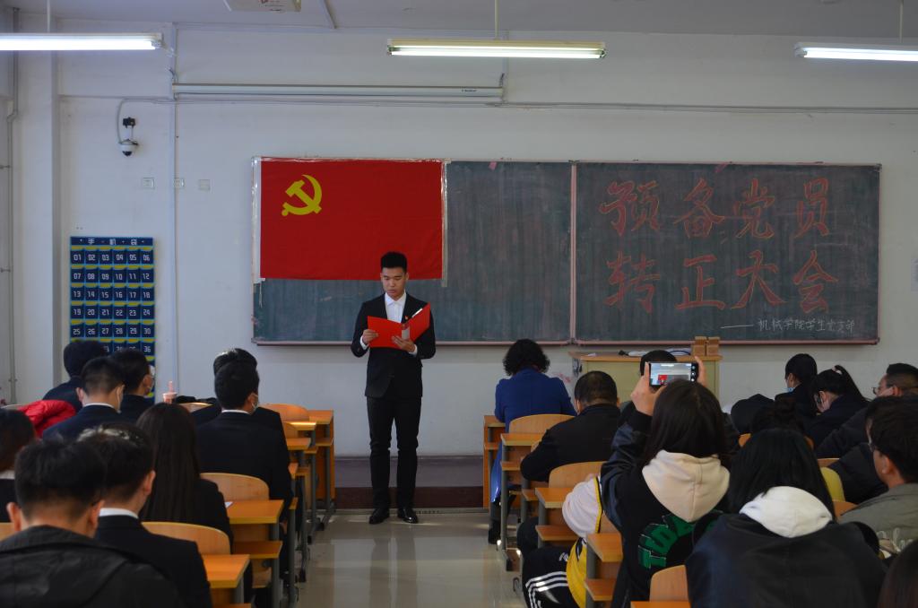 教室前方悬挂的鲜红的党旗,简而有力地为现场渲染出了庄重的气氛。大会在奏响的《国际歌》中拉开序幕。大会第一项,宣布了转正对象名单,紧接着申请转正的预备党员汇报自己在预备期间的表现,取得的成绩和进步,缺点和不足的改正情况,存在的差距和努力的方向,表明自己的态度和决心。宣读完毕之后,崔老师组织正式党员采取无记名投票的方式进行表决,作出决议。最后,支部大会通过冯海洋等19名同志转正的决议。