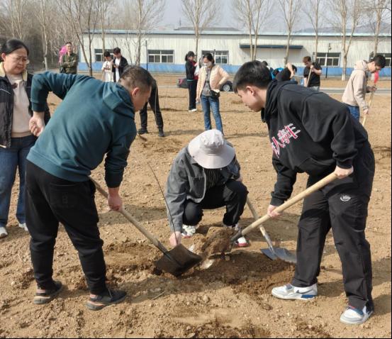 师生党员们手持铁锹、水桶等工具,按照既定的区域,有序地开展挖坑、栽种、培土、浇水等工作。大家热情洋溢,分工明确,干劲十足,每一道工序都认真细致、井然有序,活动现场呈现出一派热火朝天的劳动景象。经过一番辛勤劳动,新树苗整齐排列,在春风中昂然挺立,展现出蓬勃的生机与活力。