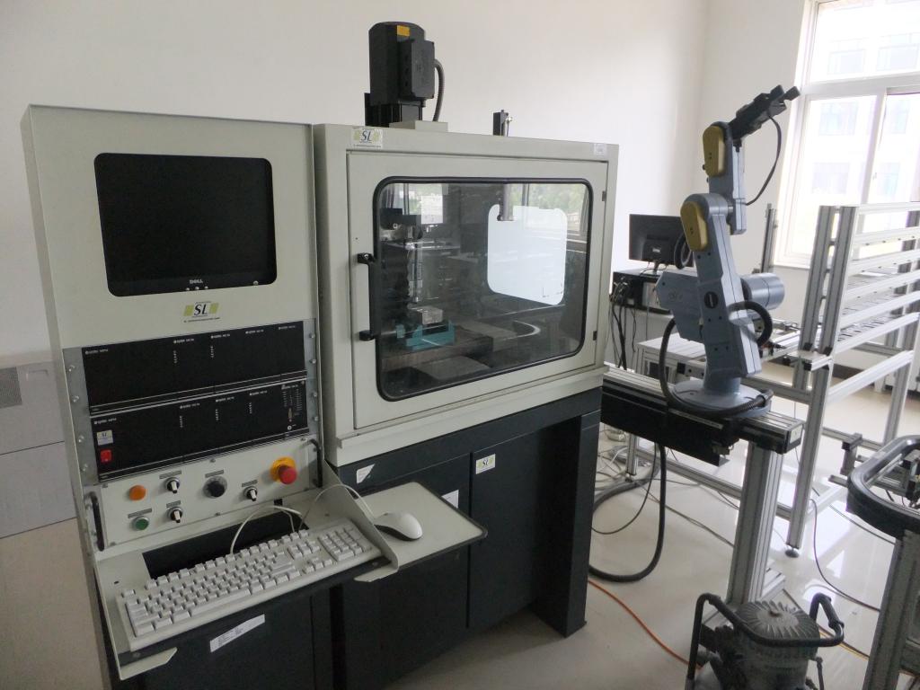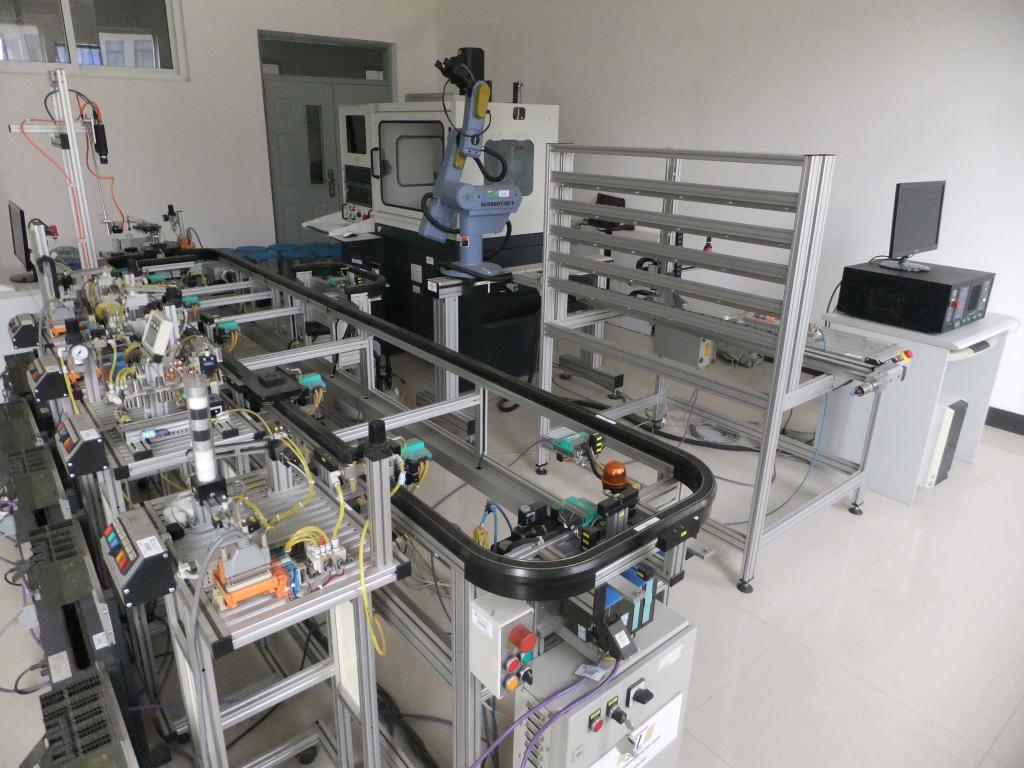 工业模块室拥有一套由德国引进的模块化生产培训系统,该系统由6个技术工作站、传输系统、自动运物小车、工业机器人、立式数控铣床及高架存储仓库组成,可完成上料、检测、分拣、测量、评估、存储、工件搬运、加工及存放等功能。模块化生产培训系统集气动技术、传感器技术、电气控制及可编程控制器技术、工业机器人技术、数控技术于一体,其中每个技术工作站既能独立工作,又可组合在一起形成一套机电一体化培训系统,各技术工作站及高架存储仓库采用西门子S7-300系列可编程控制器进行自动控制,该系统主要面向机械类专业开设专业认识实习、机电控制综合实践及毕业设计等实践课程。