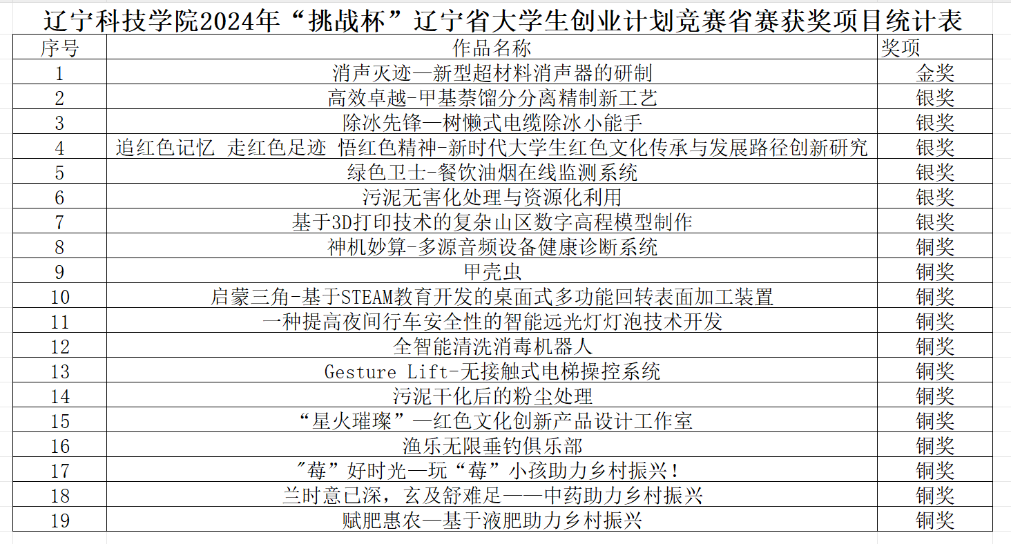 8月9日,2024年“挑战杯”辽宁省大学生创业计划竞赛决赛成绩公布,经过校赛和省级初赛、决赛的层层选拔,我校在本届竞赛中获得省赛金奖1项、银奖6项、铜奖12项。
