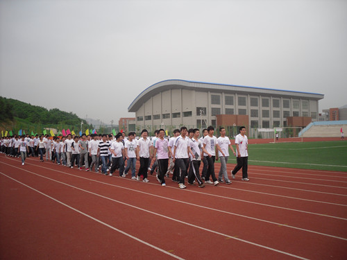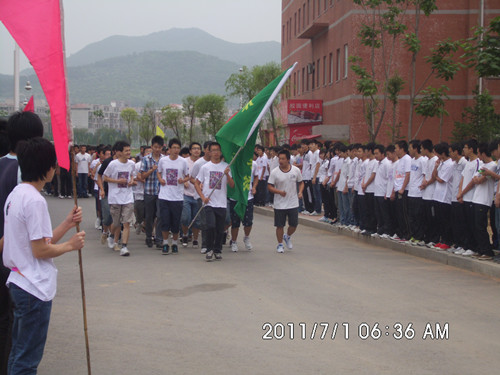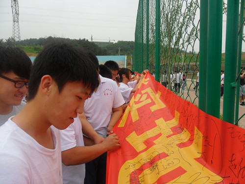 6点30分,全体离校班级统一着装,围着校园环跑一周。沿途彩旗招展,在校学生在路两旁喊着口号,鼓掌加油,迎接离校学生进入体育场。7点整,升旗仪式正式开始。教师代表刘志刚老师致辞,离校学生代表、在校学生代表分别发言,随后全体离校学生在国旗下庄严地进行集体宣誓。127名本科毕业生在“明道明德求新求实,脚踏实地,奋发成才”的20米条幅上签下了自己的姓名。