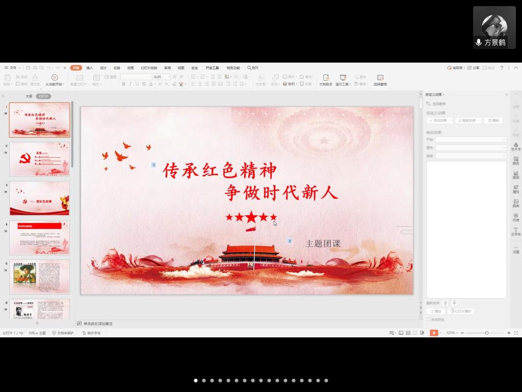 团课一开始,同学们通过网络共同观看了“90后,00后成战疫主力军”短视频,一段视频,记录了他们在武汉与病毒苦战的故事。他们,是父母放心不下的孩子,却身披“战袍”挑起了大梁!令所有同学都十分敬佩。这些人很平凡,一样是普通人,他们也有亲朋好友,有自己快乐的生活,为什么他们却能这样无私的奉献,因为他们有精神,有伟大的革命精神,这样的革命精神早已经随着这些有激情的党国人士传播到每个中国人的心底。