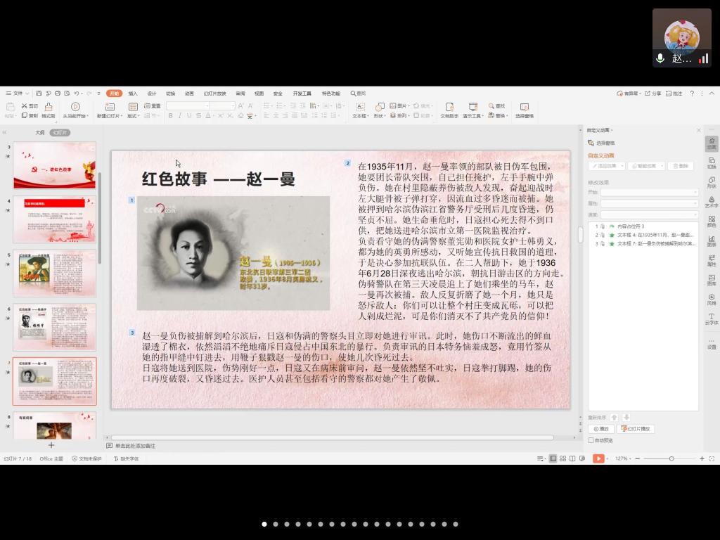 接着由袁东旭、苑佳诚,赵益宁等同学为同学们读了一段段红色故事和英雄事迹。正是因为他们的不懈奋斗,不怕吃苦,才最终得到抗战胜利。我们或许做不了太多,我们没有革命先烈“头可断血可流”的大义凛然,但我们可以发扬不怕吃苦,不怕辛劳,有理想信念,有奋斗目标的上进精神,传承中华民族优良的红色基因,争做新中国优秀的时代新人。