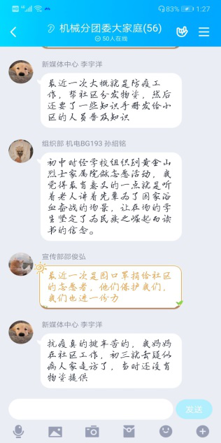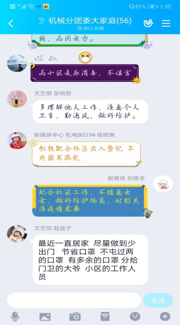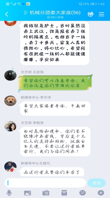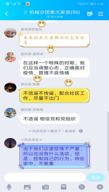 在研讨会的最后,几位同学也讲述了各自家乡有关疫情防控的事。如汽车BG18的赵跨跃同学所说:“如果我们什么都做不了,那就宅在家里默默为那些逆行者们祈祷。”