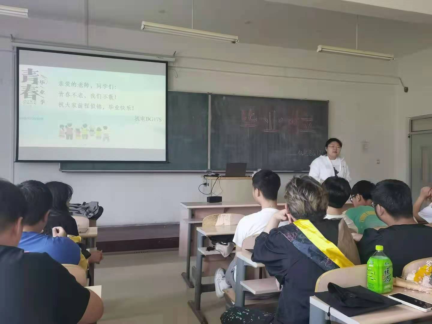 毕业照拍完之后,大家根据通知安排,移步C3310,于上午10:00举行最后一次主题班会。此次班会由班级团支书梁佳唯主持,班主任肖萌老师和机电BG17S全体成员参加。