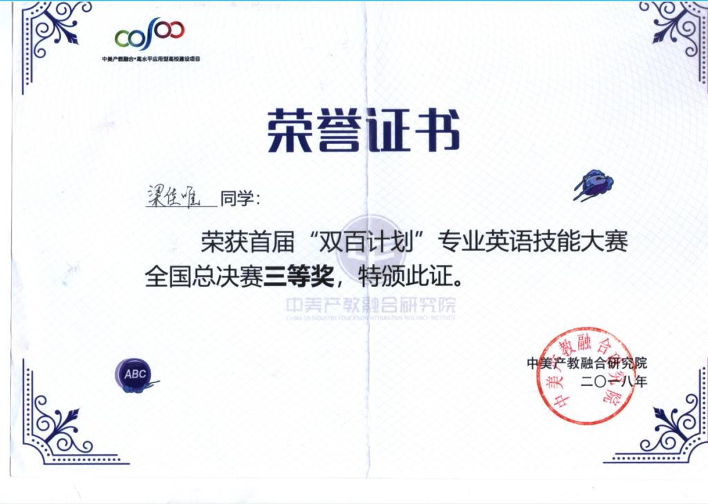 四年间,他综合成绩专业前10%、荣获国家级奖项10项:2018年12月国家励志奖学金;2019年12月国家励志奖学金;2020年12月国家励志奖学金;2019年度“中国大学生自强之星”;“全国大学生环保知识竞赛”志愿服务工作优秀志愿者;“全国大学生艾滋病预防知识竞赛”志愿服务工作优秀志愿者;“双百计划”专业英语技能大赛全国总决赛三等奖;探寻抗联足迹,共筑红色之梦国家级大创项目立项;大学生英语四级等级证书;大学生普通话水平等级证书。