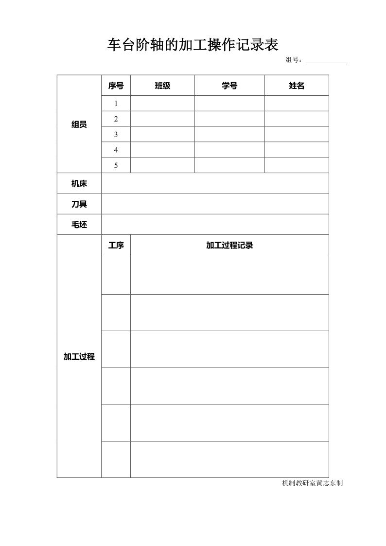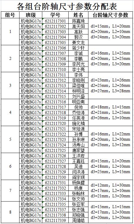 机电BG17s班共38人,每五名同学为一组,共分为8组。每组按照给定的尺寸参数,完成一个“车台阶轴”项目。每组需绘制台阶轴的零件图,要求CAD绘图,并A4打印。同时,手写完成加工操作记录表。